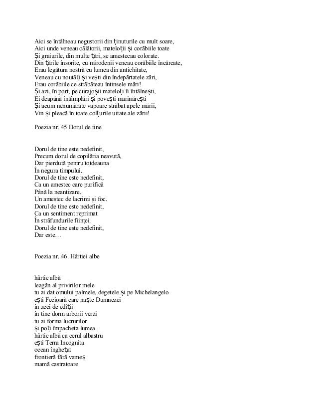 Pdf Mihai Eminescu LuminÄ De LunÄ Luz De Luna Antologie Traducere PrefaÈÄ NotÄ Asupra EdiÈiei Note Èi Comentarii De Dorel Finaru Èi Enrique Nogueras Antologia Traduccion Prefacio Nota Sobre La Edicion Notas Y Comentarios Source from : https://www.academia.edu/43507026/Mihai_Eminescu_Lumin%C4%83_de_lun%C4%83_Luz_de_luna_Antologie_traducere_prefa%C8%9B%C4%83_not%C4%83_asupra_edi%C8%9Biei_note_%C8%99i_comentarii_de_Dorel_F%C3%AEnaru_%C8%99i_Enrique_Nogueras_Antolog%C3%ADa_traducci%C3%B3n_prefacio_nota_sobre_la_edici%C3%B3n_notas_y_comentarios_de_Dorel_F%C3%AEnaru_y_Enrique_Nogueras Un român pășește pe apa dunării.(румын шагает по воде). Daca ar fi invins iubirea poetului , femeia ar fi invins martea devenind simbolic eterna. In romanta ,,pe langa plopii fara sot eminescu merge cu filozofia mai departe, iubirea este incadrata intre ,,fizic si metafizic se sparge iar sentimentul de dragoste pentru femeia iubita tinde catre absolut. Motivul 'florii albastre' mai apare si la leopardi, iar la eminescu floarea albastra reprezinta viata. Considerat luceafarul poeziei romanesti,mihai eminescu a ridicat limba romana pe culmile expresivitatii conceptia e adanc taraneasca.