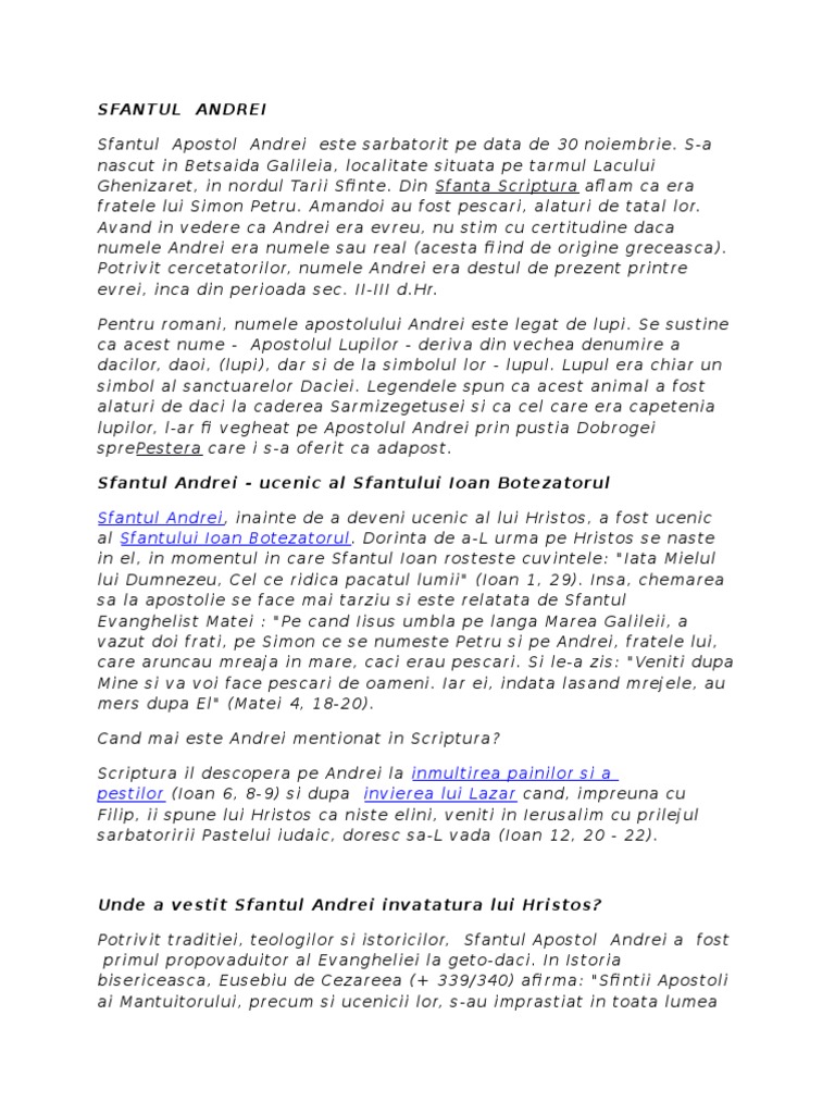 Andrei se descanta si ingroapa sub pragul grajdului un drob de sare pana primavara cand este amestecat in hrana vitelor pentru a le feri de boli si de. Moaștele au rămas întregi până în 850 când împăratul vasile i macedoneanul a decis să trimită capul sfântului andrei în patras. 44°05′n 27°50′e / 44.09°n 27.83°e.