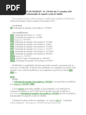 158/2005 privind concediile si indemnizatiile de asigurari sociale de sanatate, publicata in monitorul oficial al romaniei, partea i, nr. Oug 158/2005 oug 158/2005 actualizata oug 158/2005 actualizata.