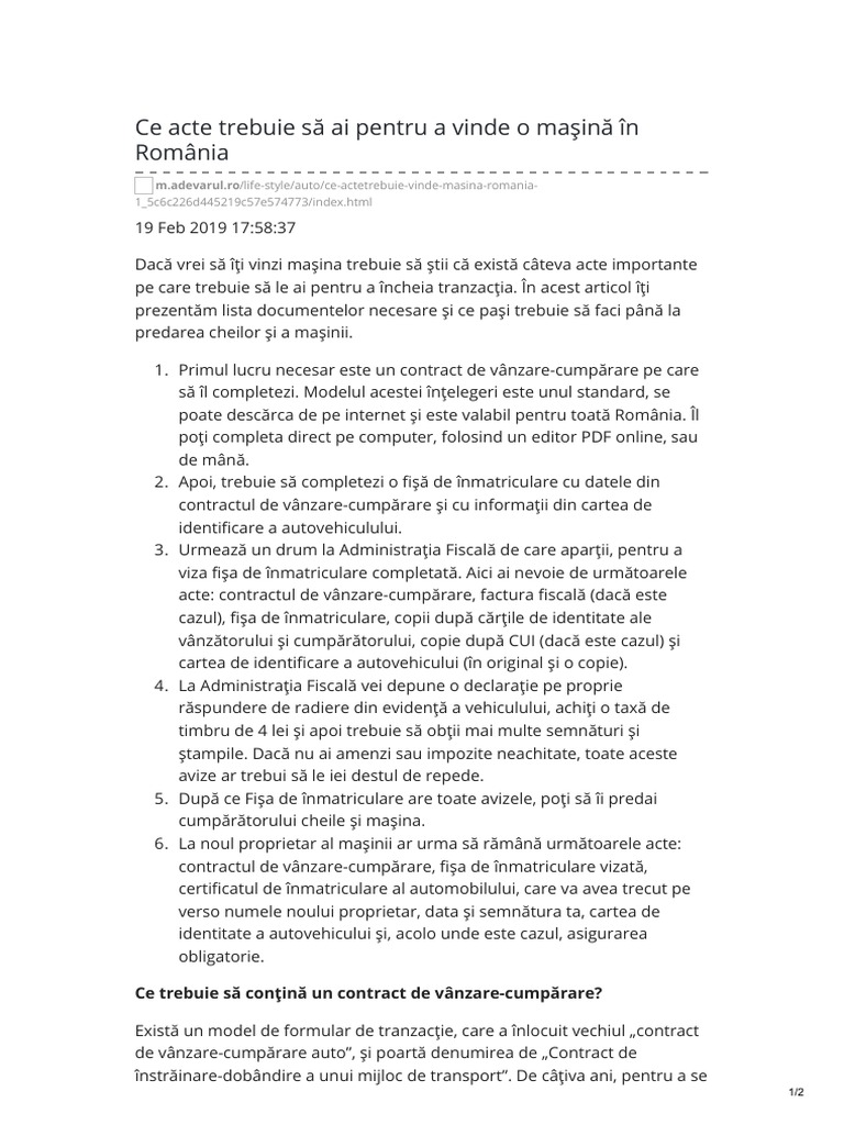 Descarcati modelul de contract de mai jos sau mergeti la orice firma care se ocupa cu realizarea contractelor de vanzare cumparare auto: Ce acte sunt necesare pentru. Mergeti la un birou de facut acte auto si faceti contract vanzare/cumparare cu vanzatorul.
