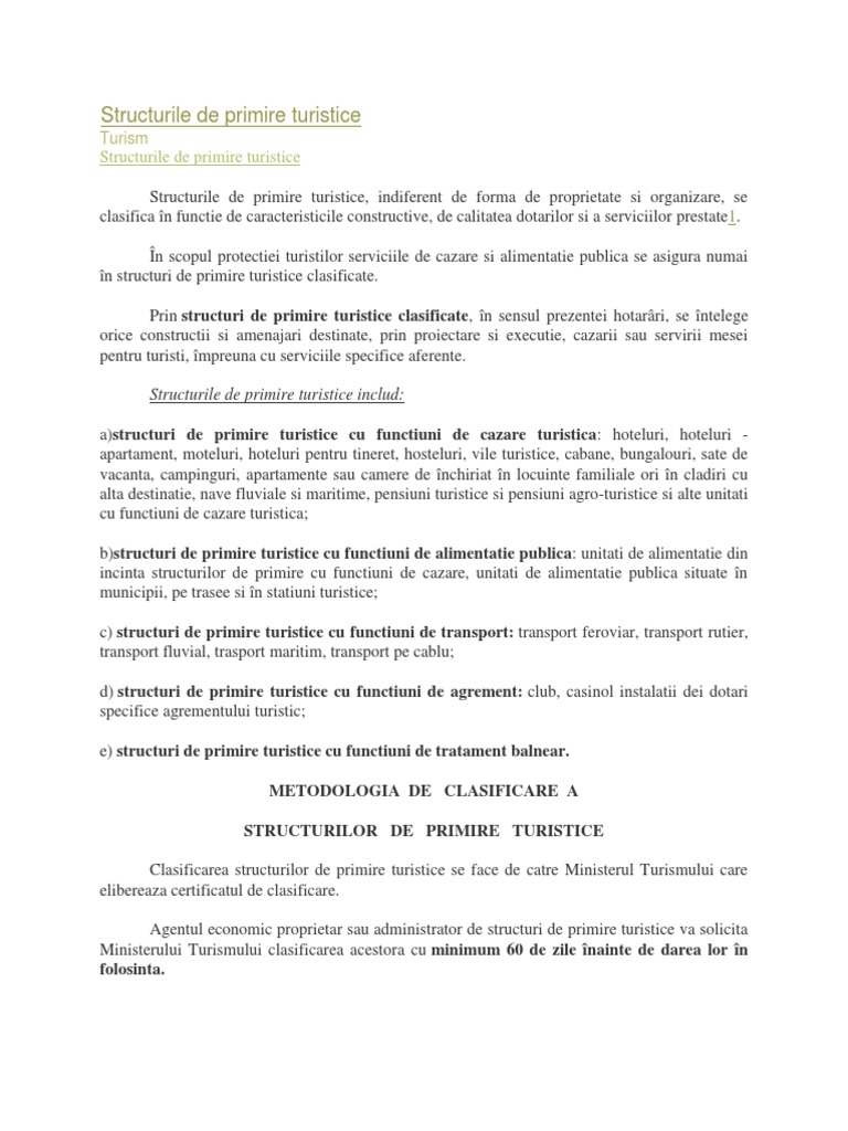 vizitati articolul complet aici : https://www.romaniaturistica.ro/consultanta/lectia-de-turism/4/clasificarea-structurilor-de-primire-turistice Sunt companii care detin unitati de cazare sau care vand pachete de servicii turistice, fara a fi clasificate sau licentiate, astfel ele nefiind cea mai mare problema in acest proiect o constituie,insa, numarul insuficient de angajati cu atributii de control, in cadrul ministerului turismului existand doar. Unitati de cazare foarte curate. Ministerul turismului sustine ca va plati peste 81 de milioane de lei din banii romanilor pentru constructia unei partii de schi de 2.650 in realitatate, numarul acestora, in total, era de peste 34.000 de unitati, la inceputul lui 2009, in crestere cu 12 procente fata de.